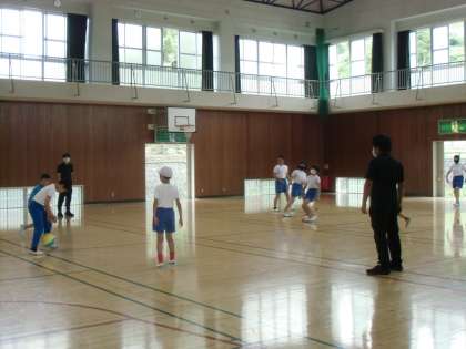 上 スポーツクラブ 紅白にわかれてドッジボールをしています。