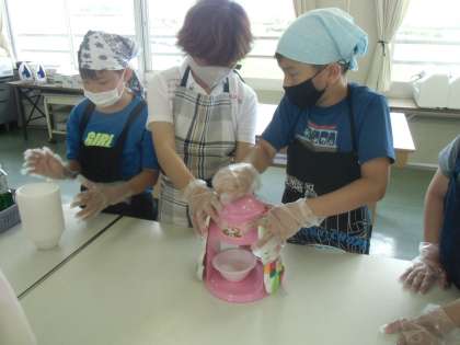 中 家庭科クラブ かわいいかき氷機で氷を削っています。