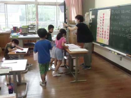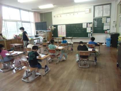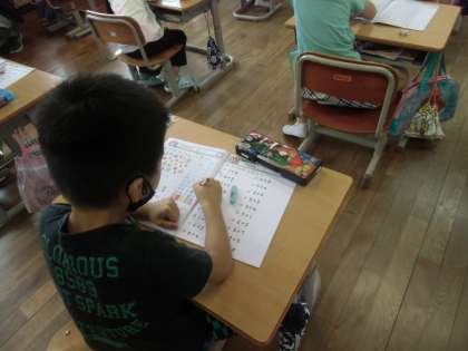 1年生の算数です。「どちらがいくつ多いかな」。日常でよく使う引き算の勉強をしています。問題が解けたら先生に見せにいきます。