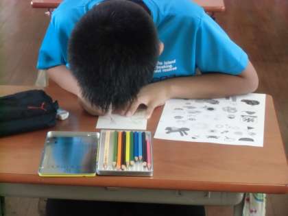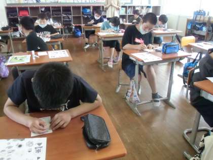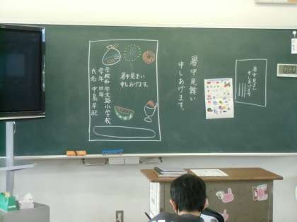 4年生の図工では夏の風物詩である暑中見舞いのはがきづくりをしています。イラストを選び、色を塗って夏らしい作品をめざします。
