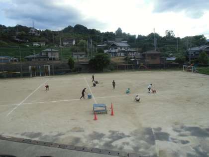 子どもたちが帰ったあと、先生たちは運動会練習のために運動場準備を行いました。ポイントを打ち、ラインを引いたら完成です。昼間はまだまだ暑さが残ります。熱中症に気をつけて、また、感染症対策もしながら明日からの練習もがんばりましょう。