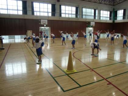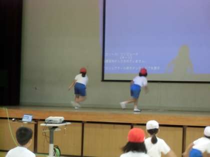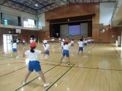 雨が降っていたので体育館で練習です。ステージで踊る二人に合わせてみんなでダンスをしています。だんだん動きが大きくなってきているようです。