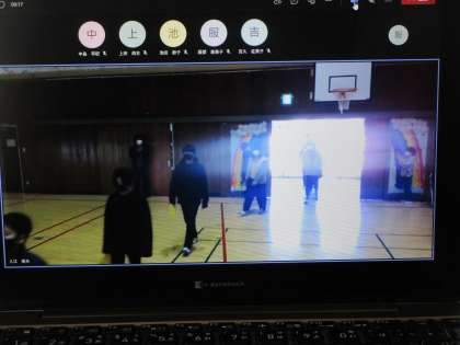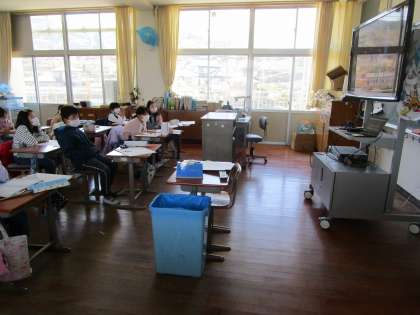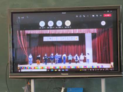 6年生を送る会を実施しました。発表する学年だけが体育館に行って6年生児童の前で発表します。他の学年の児童は教室に配信された画をテレビで見ます。