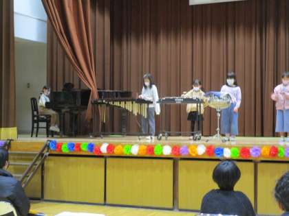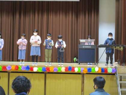 2年生の児童は○×クイズと合奏、呼びかけを披露しました。「6年生の〇〇ちゃんの一番うれしかったことは6年生のみんなに会えたことである。マルかバツかー?」正解は「マルー!」