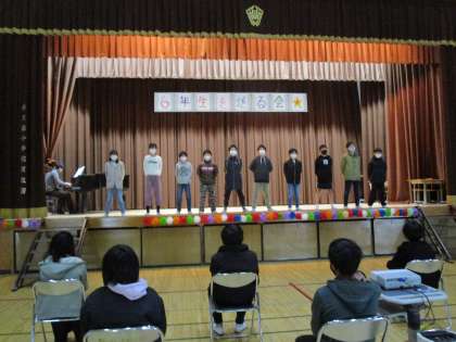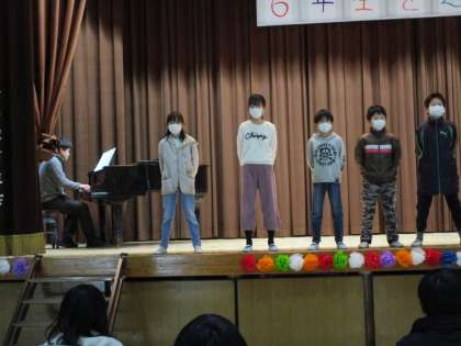 合唱、ピアノ伴奏は担任の先生です。しっかりと6年生児童を見て堂々と歌っている5年生児童の姿は成長の証です。