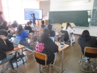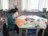 1・2年生の算数の様子です。1年生は「かずくらべ」で「どのくだものがおおいか」という問題を解いていました。2年生は「ペットボトルの水のかさ」を1dLマスを使って考えていました。