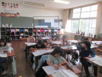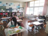1・2年生の算数の様子です。2年生は2・3・4・5の段の九九の練習をしていました。1年生はくり上がりのたし算の問題を解いて黒板に答えを書いていました。