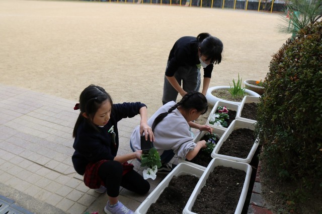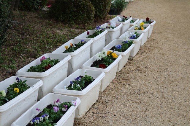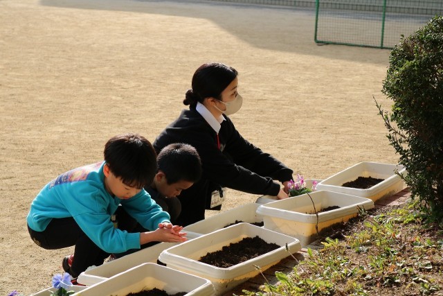 1~4年生の子どもたちが校庭のプランターにパンジーとビオラを植えました。