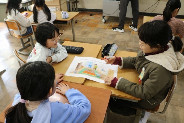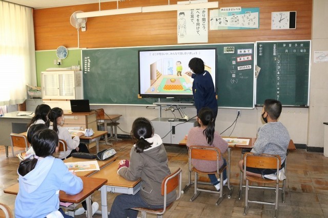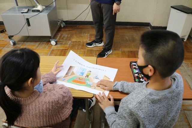 子どもたちは、部屋の絵を見ながら、高齢者の人が生活するには危険なところがどこかをグループで考えたり、高齢者や認知症に関するクイズをしたりしました。