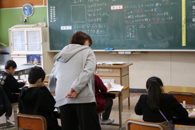 3年生は算数で小数の学習をしていました。わからないときは先生に質問して、一生懸命がんばっていました。
