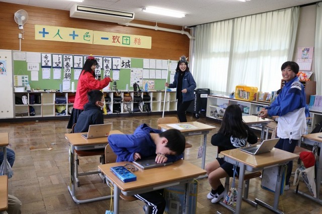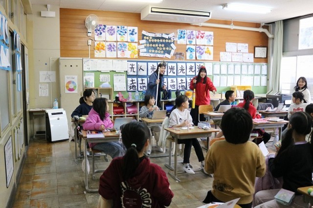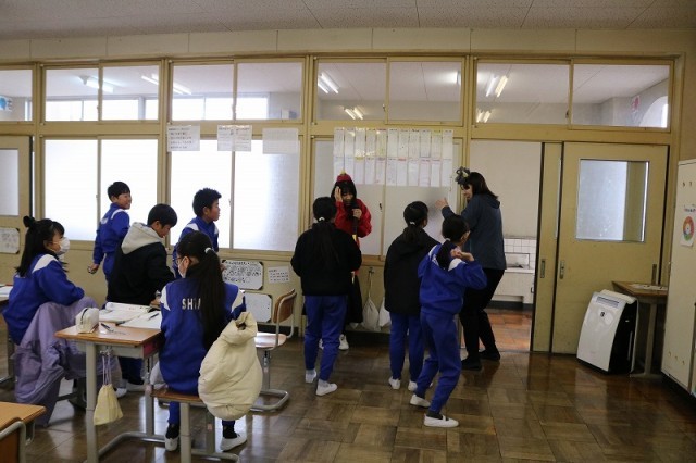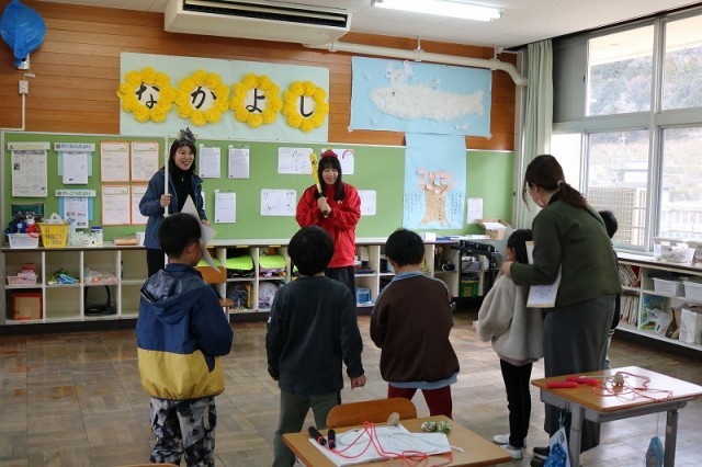「おにはそと!」元気な声が教室中に響き渡り、子どもたちは笑顔いっぱいで豆をまきました。