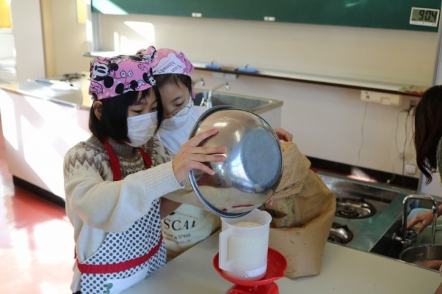 今日の作業はお米をはかって、洗い、水につけることです。 子どもたちは「水がめっちゃ冷たい!お母さんは毎日お米を洗ってくれてるんや。」とお母さんに感謝しながら、丁寧にお米を洗っていました。