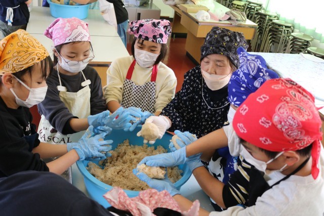 みそつくりの4日目は、麹とマッシャーでつぶした大豆を混ぜ合わせ、容器に詰める
