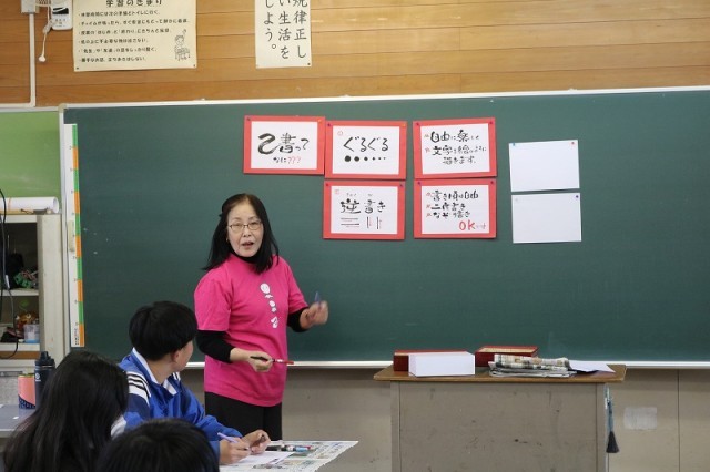 2月16日(月) 6年生では、己書(おのれしょ)の師範の先生をお招きし、特別...