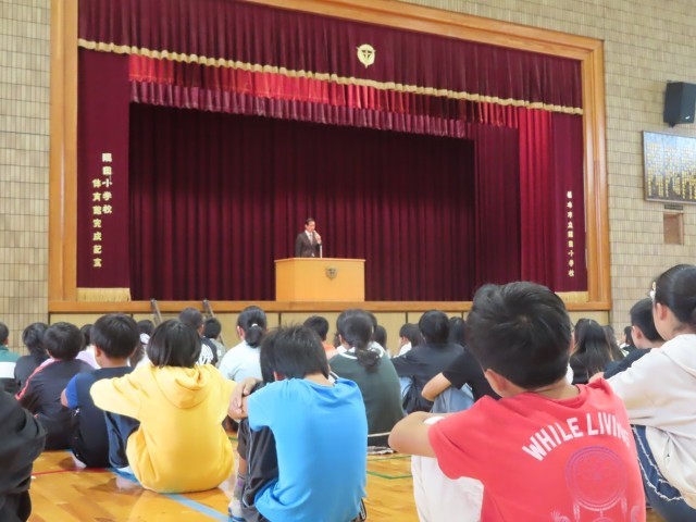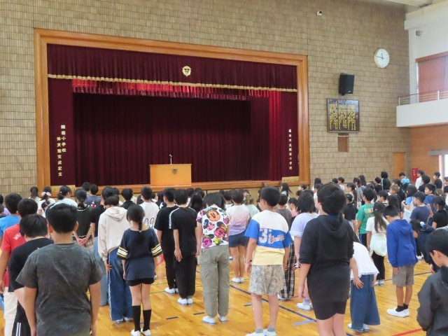 校長先生から1学期のみんなのがんばりをほめていただいたり、生活の決まりについての振り返りをしていただいたりと2学期に向けて大切なお話をしていただきました。校長先生の顔を見てしっかりと聞くことができていました。