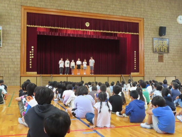 その後、1学期児童会役員さんから任期終了のあいさつがありました。「はじめは大変だったけど、最後はやっていてよかった」という本当にうれしい言葉があり、大きな成長を感じました。みんなからの大きな拍手にもしっかりと感謝の気持ちを感じましたよ。