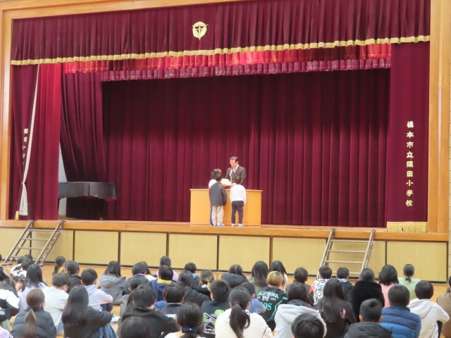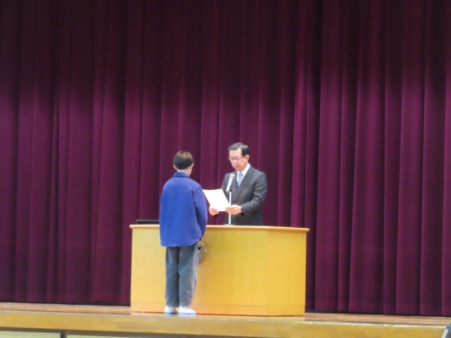 本日4限目に全国児童画コンクール、租税教室推進校、校内マラソン大会の表彰と冬休み前集会をおこないました。