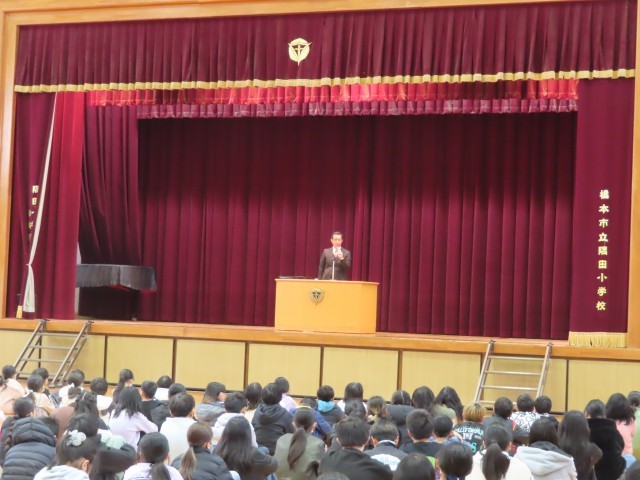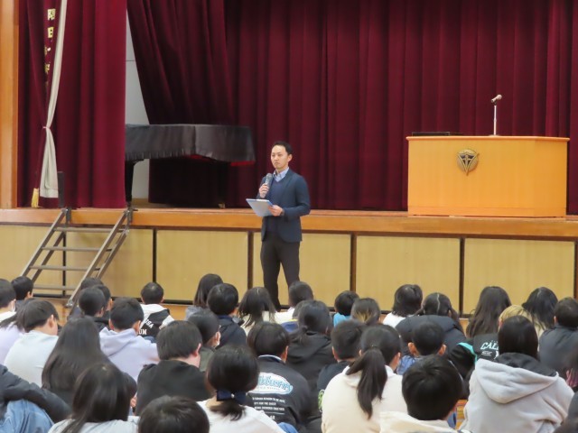 校長先生と生徒指導の先生から、冬休みの過ごし方についてのお話を聞きました。
