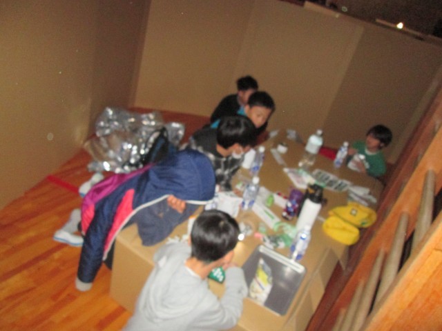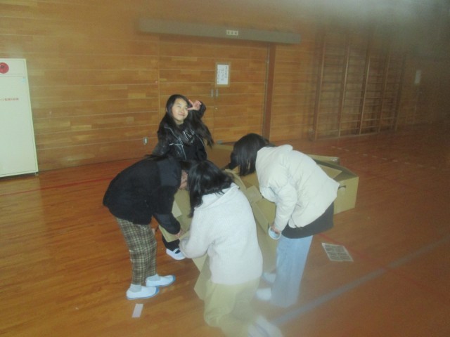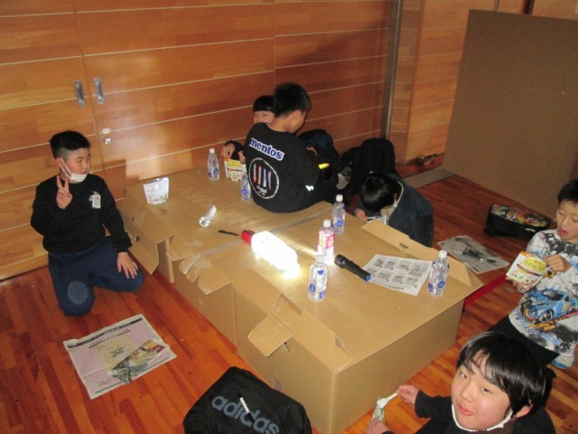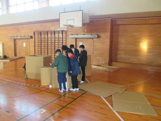 1月13日は防災学習の一環で避難所体験学習をしました。冬休みや連休中に避難所での生活で必要なものは何か防災バックの中身を考え、準備してくれたと思います。各々準備してきたものを活用して、学習に取り組んでいました。まず、実際に使用する避難者名簿に記入をしました。次に、パーティションやダンボールベットを組み立て、プライバシーを保護することのできる空間つくりをしました。その後は、新聞紙を活用し、スリッパの作成をしました。児童によっては、素足と新聞紙スリッパで比較を行い、どんな違いがあるのか話し合っていました。