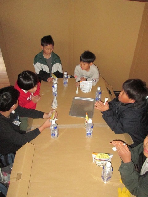 11時ごろには、防災窯を活用して、火をおこし、昼食用のお湯を沸かしました。宿泊体験学習での火おこしの学びの経験がいきていました。