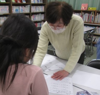 地域の方に宿題を見てもらい、学習の復習プリントをチェックしてもらいました。