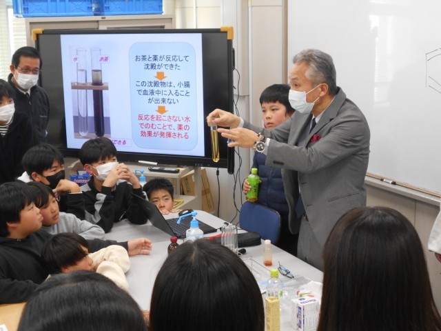 タバコやお酒、違法ドラッグの危険性をわかりやすく教えていただいたり、なぜ危険とわかっていてもやめられないのかについても説明していただきました。また、授業の最後には実験を交えながら医薬品の正しい服用の仕方について教えていただきました。今日学んだことをぜひおうちでも伝えてください。