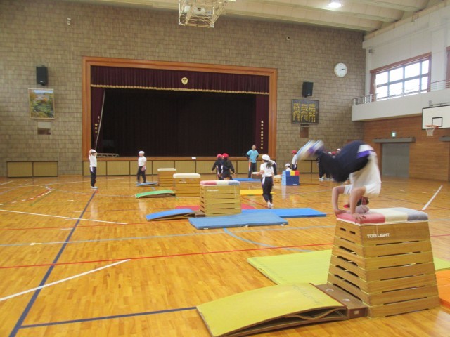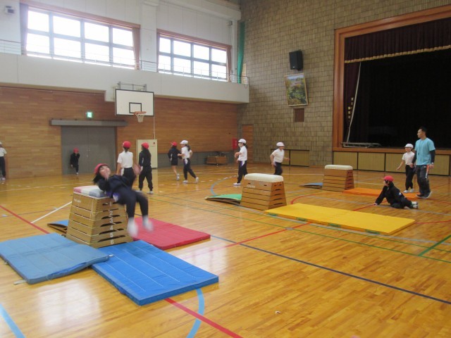 「開脚跳び」「かかえこみ跳び」「台上前転」「伸膝台上前転」の練習を一生懸命励んでいます。