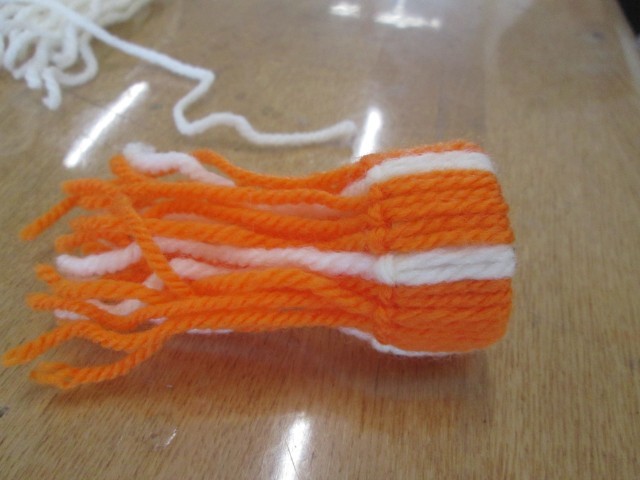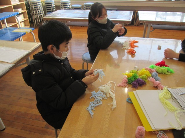 今日のふれあいルームは、季節のキーホルダー「毛糸の帽子作り」でした。トイレットペーパーの芯材と毛糸を使用した作品で、素材を生かした素敵なキーホルダーが出来上がりました。