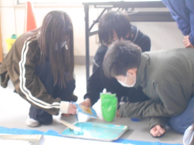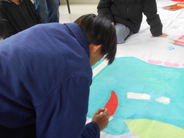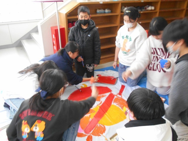 1週間後に卒業を控えた6年生。卒業制作として大きな布に絵を描いているみたいです。