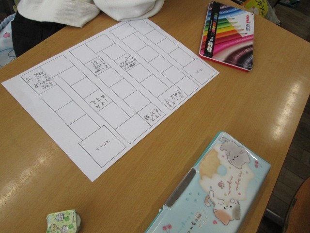 今日は、箱の学習で作成したさいころを使ってすごろくを作って遊びました。