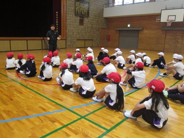 並び方や「右向け右」などの基本を確認したあとは、体つくり運動に取り組みました。