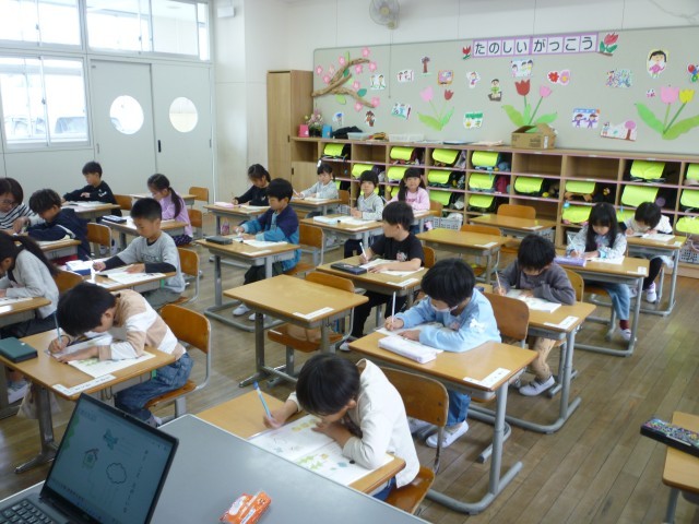 「今日はなんの勉強するの~?」と毎日ワクワクな子どもたち。『ぺたぴんとん!』を合言葉にいい姿勢で学習に取り組んでいます。