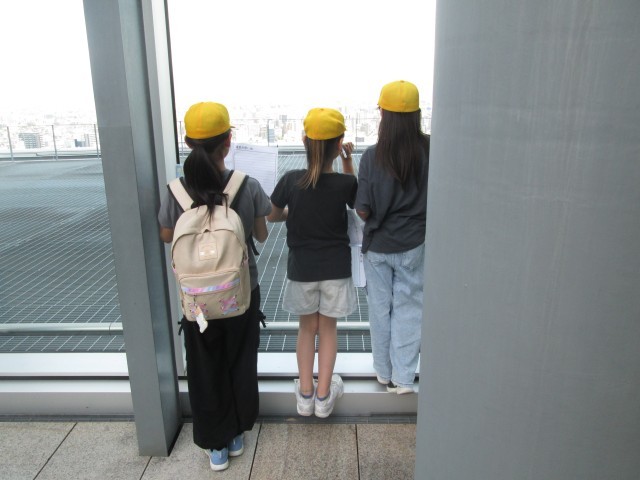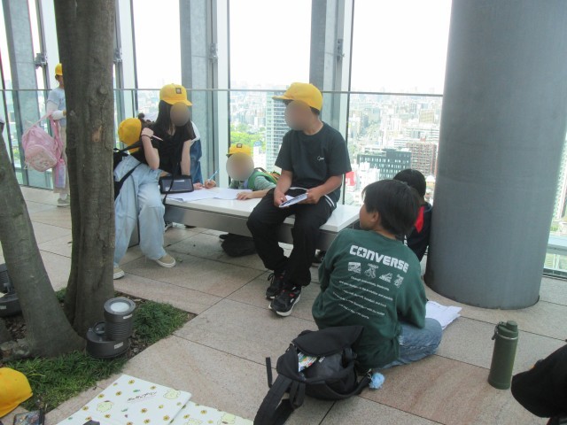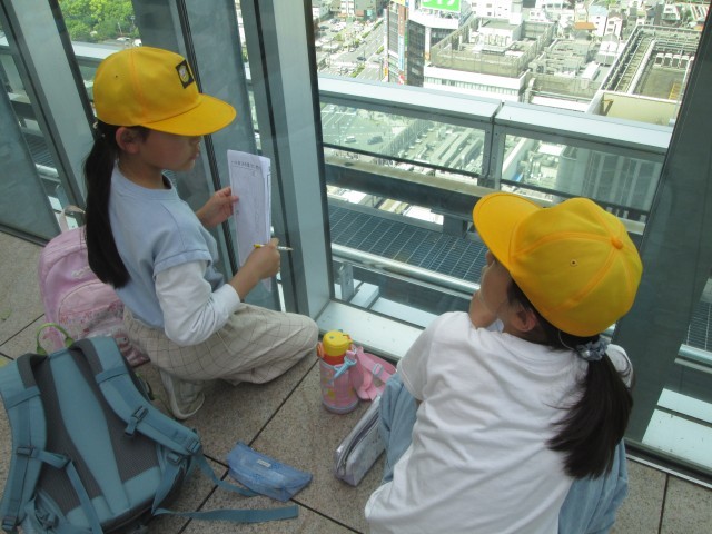 子どもたちは、周りに何が見えるかな?と北や東、西側をのぞきこんで見つけた建物などをしおりにメモやスケッチをしていました。