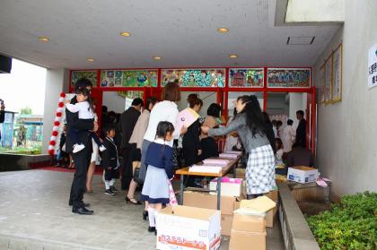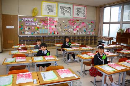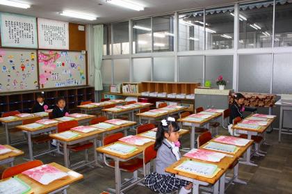 受付を済ますと、新入児は6年生に案内されて、教室に向かいました。