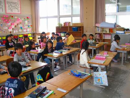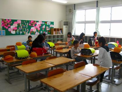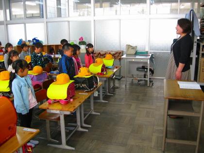 みんながそろうと、起立の練習や片付け方を教えてもらいました。