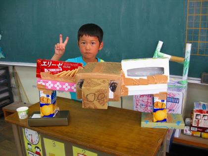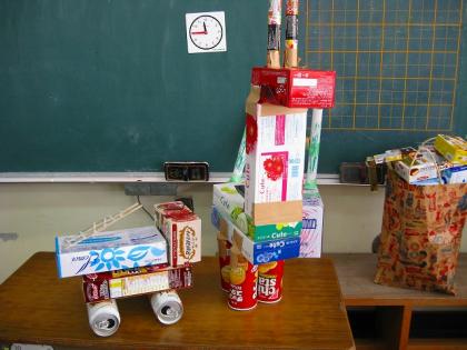 1年生の教室に行くと、箱や空き缶で、いろんなものを作っていました。