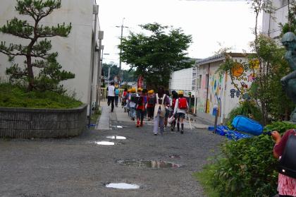 普段はバス通学児童が半数以上いますが、今日は全員、歩いての下校です。
