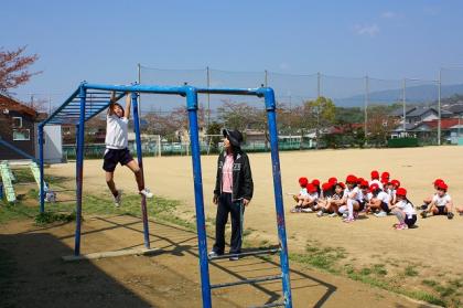 温かい日差しの中、鉄棒と雲梯をしていました。