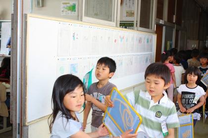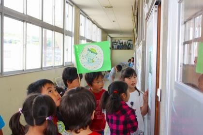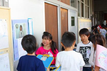 2年生は、旗を持つ子、説明する子、シールを貼る子など、仕事を分担していました。