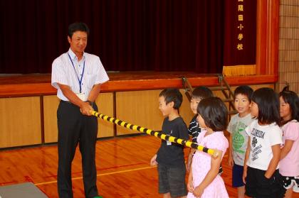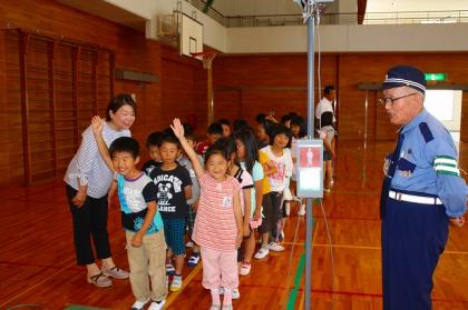 はじめに、交通指導員の皆さんから、横断歩道の渡り方や踏切での注意などの説明を受けました。