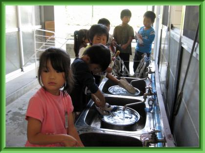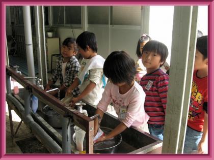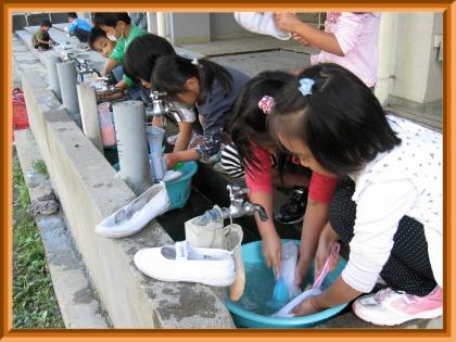 1年生では、今日、自分のうわぐつを洗うことに挑戦しました。