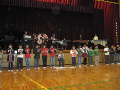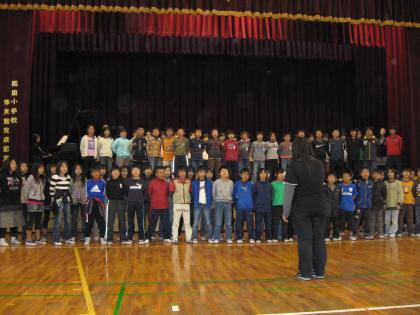 歓迎の意味を込めて、児童の挨拶のあと、隅田中学校吹奏楽部・恋野小学校・隅田中学校と合奏や合唱をしました。