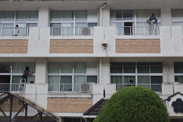 運動場・校舎周辺の草刈り・草引き、校舎内の窓ふきとサッシの溝掃除などをして、