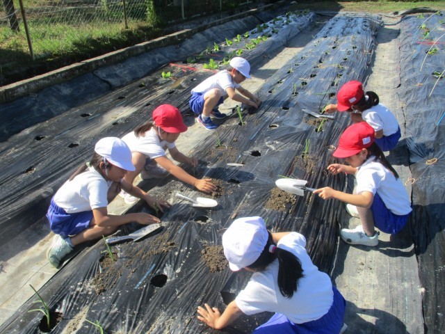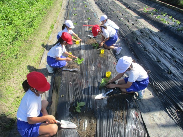ボランティアの方々が整地してくださった畑に、白菜と玉ねぎの苗を植えました。