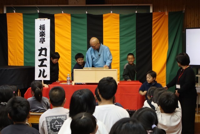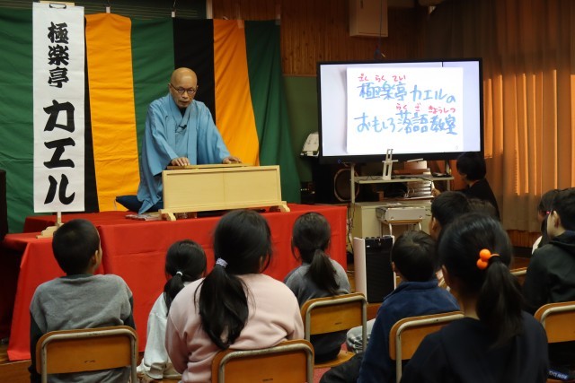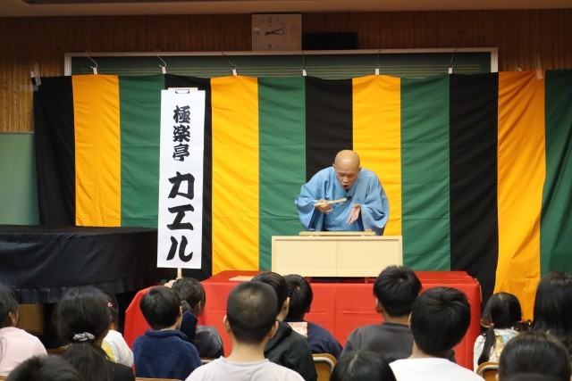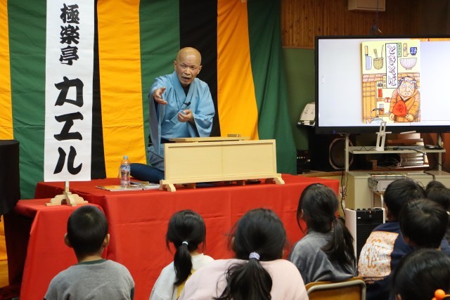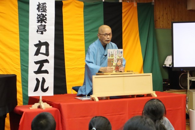 全校児童を対象に、隅田地区在住の極楽亭カエルさんに「落語」を聞かせていただきました。