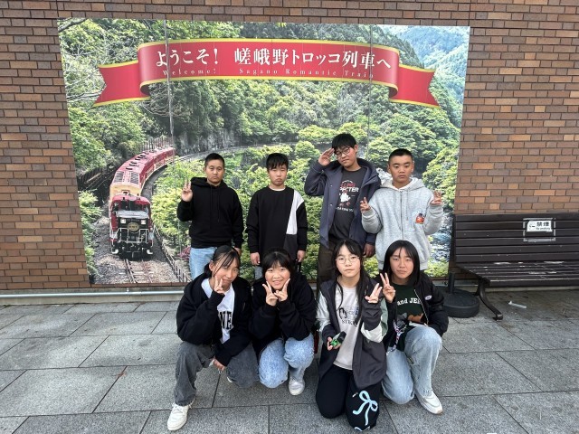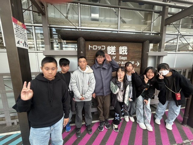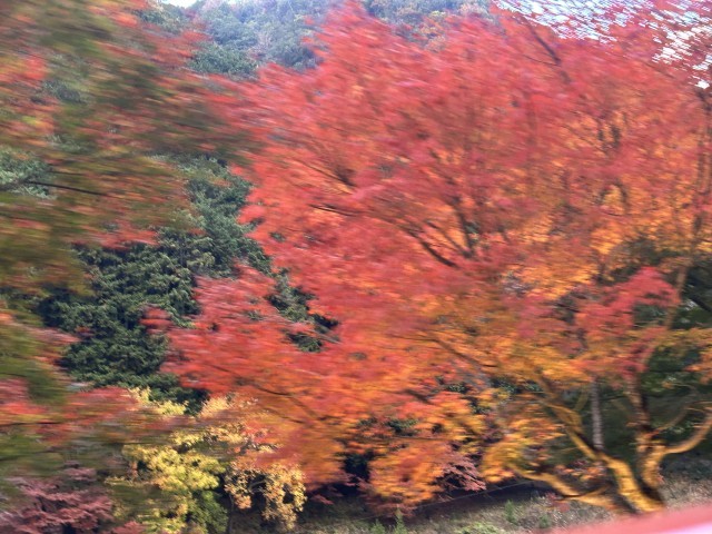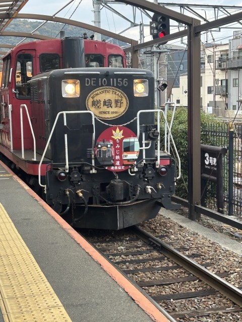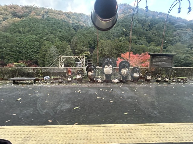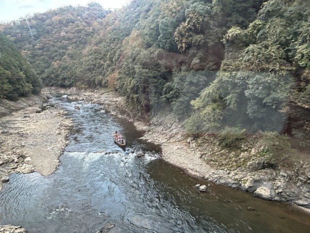4番目の目的地は、トロッコ列車嵯峨野駅です。亀岡駅に向かって登りました。車窓からは、紅葉と保津川下りの舟を見て、手を振りました。