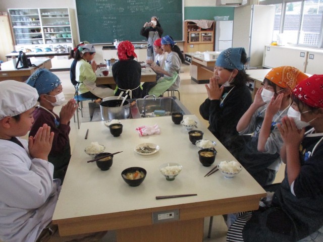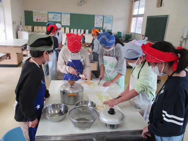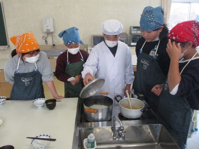 11月28日(金)今日は家庭科の時間に「米飯」「味噌汁」の調理をしました。お鍋でお米を炊く経験は子どもたちにとって初めてのことでしたが、鍋から聞こえる音や湯気の様子を観察し、時間を測って上手に炊くことができました。お味噌汁はいりこのだしをとり、にんじん、大根、白菜、豆腐、油揚げ、ネギを具材にして作りました。自分たちで作った料理はいつも以上においしく感じたようで、おかわりもたくさんしました。グループで協力して手際よく調理や後片付けをする姿がとても頼もしかったです。