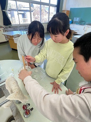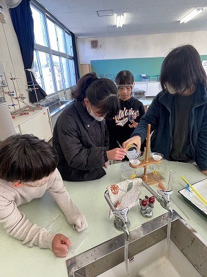今日は食塩やミョウバンを入れた水溶液をろ過して、残った水溶液から溶けていたものを取り出す実験を行いました。