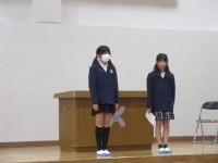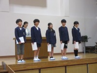 後期児童会役員5名が任命書を受け取った後、新役員が「自覚と責任のバトン」を引き...