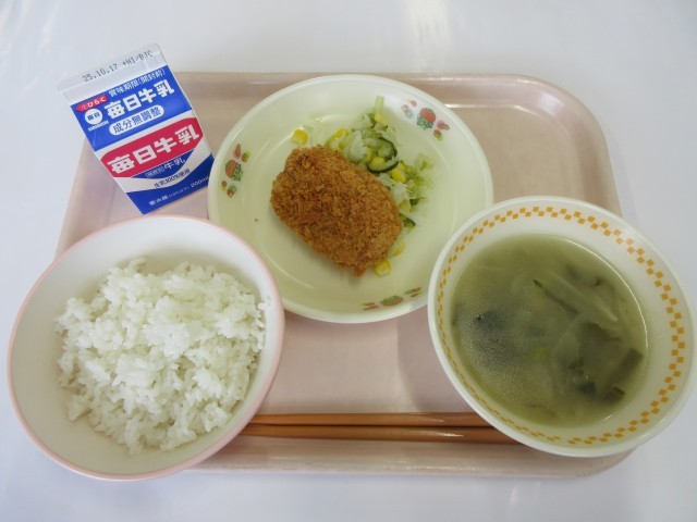 本日の献立は,ごはん,カレーコロッケ,コールスローサラダ,ぐだくさんスープ,牛...